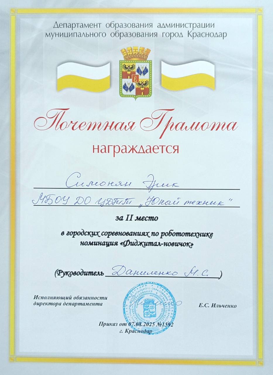 Симонян Эрик награжден почетной грамотой за II место в городских соревнованиях по робототехнике, номинация «Фиджитал-новичок»