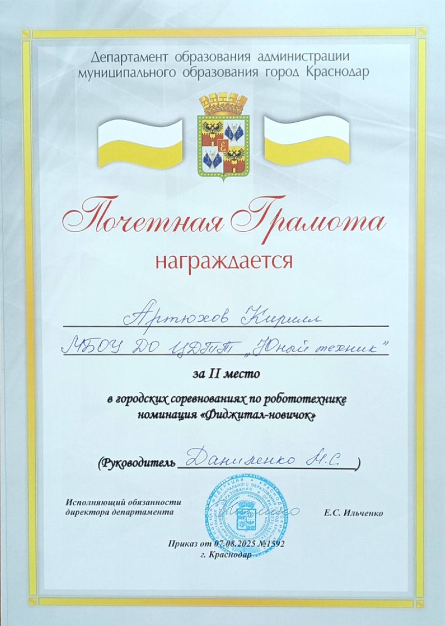 Артюхов Кирилл награжден почетной грамотой за II место в городских соревнованиях по робототехнике, номинация «Фиджитал-новичок»