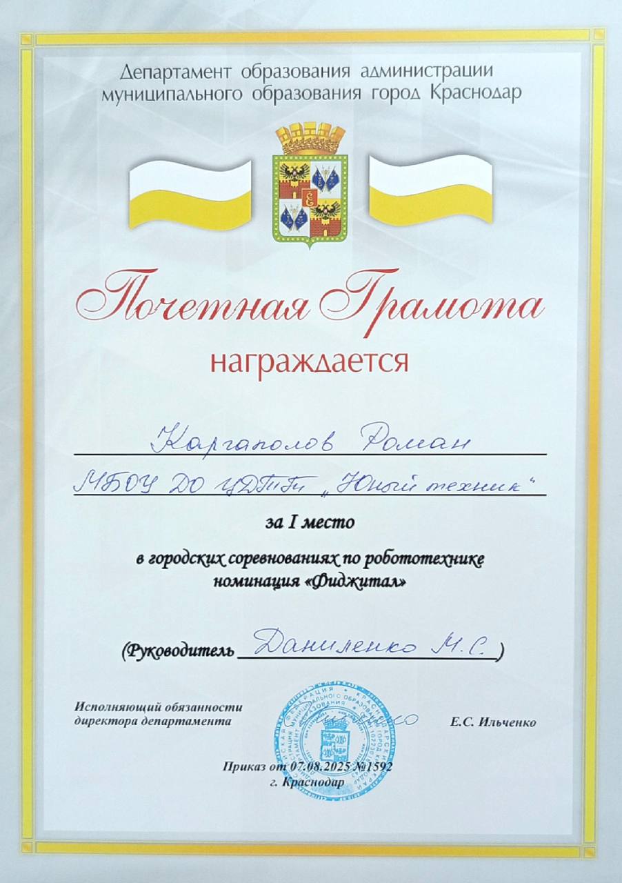 Каргаполов Роман награжден почетной грамотой за I место в городских соревнованиях по робототехнике, номинация «Фиджитал»