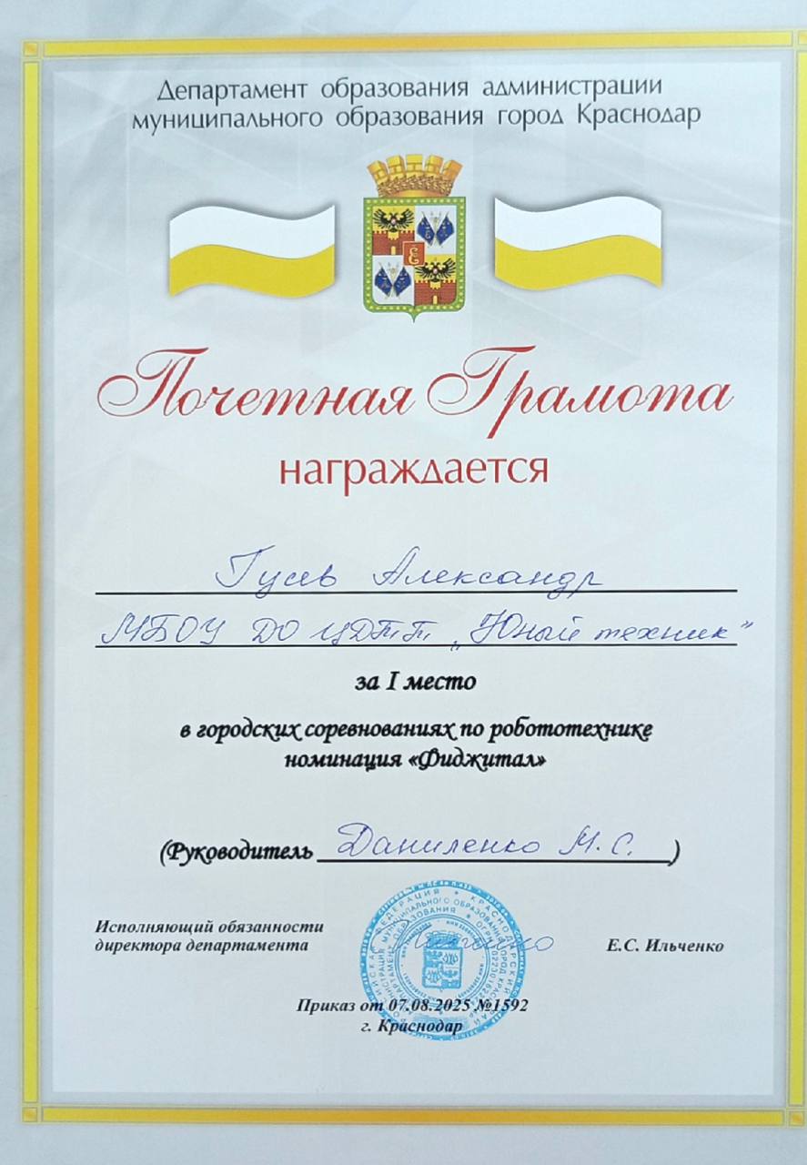 Гусев Александр награжден почетной грамотой за I место в городских соревнованиях по робототехнике, номинация «Фиджитал»