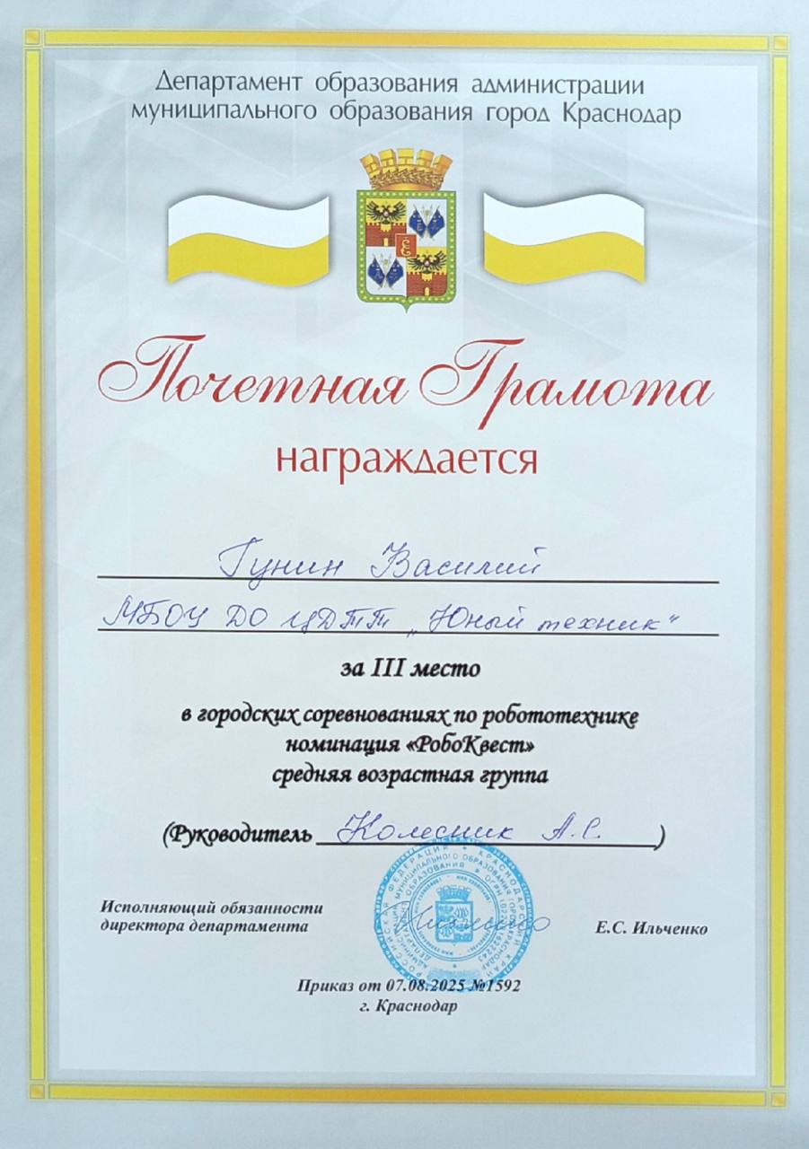 Гунин Василий награжден почетной грамотой за III место в городских соревнованиях по робототехнике, номинация «РобоКвест»