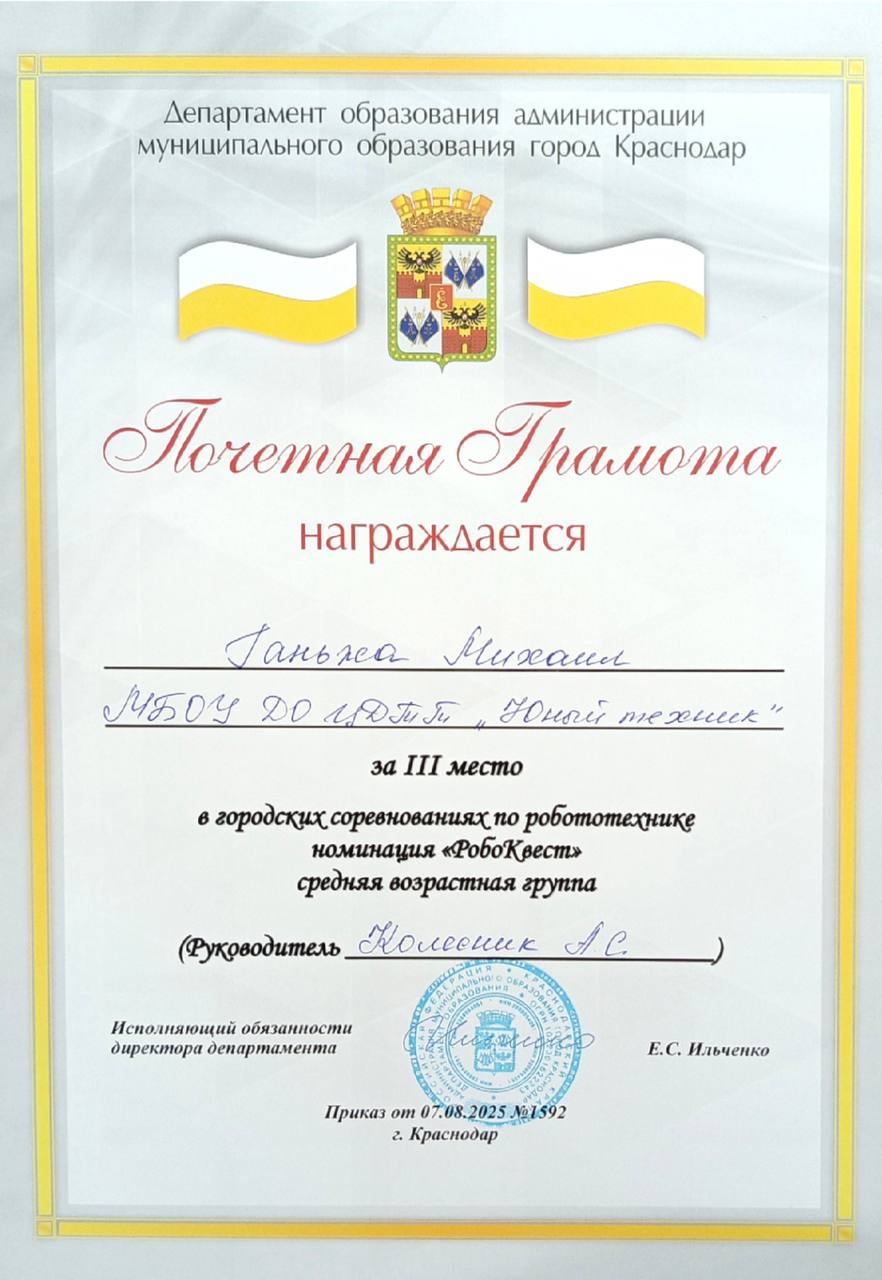 Ганьжа Михаил награжден почетной грамотой за III место в городских соревнованиях по робототехнике, номинация «РобоКвест»