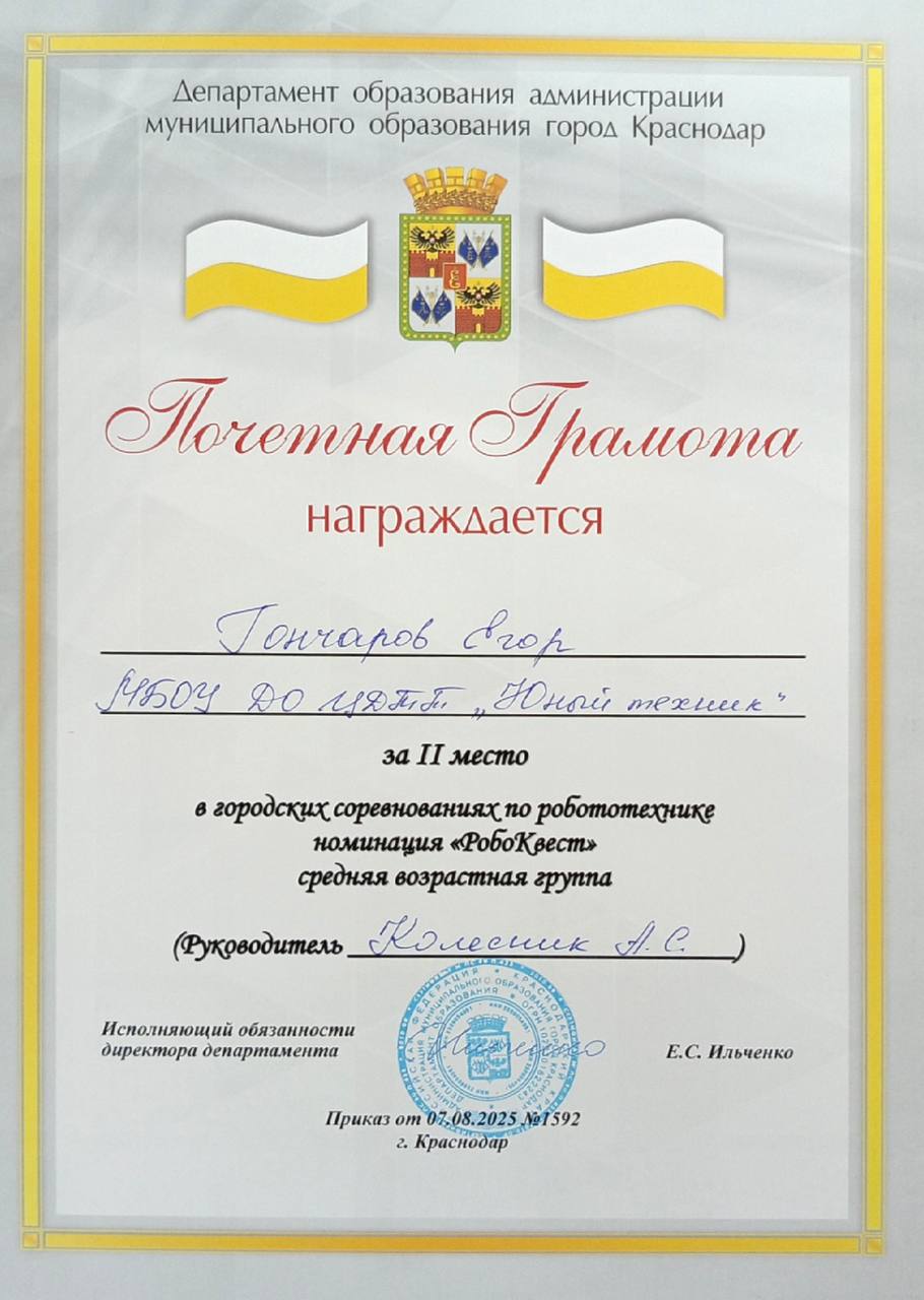 Гончаров Егор награжден почетной грамотой за II место в городских соревнованиях по робототехнике, номинация «РобоКвест»